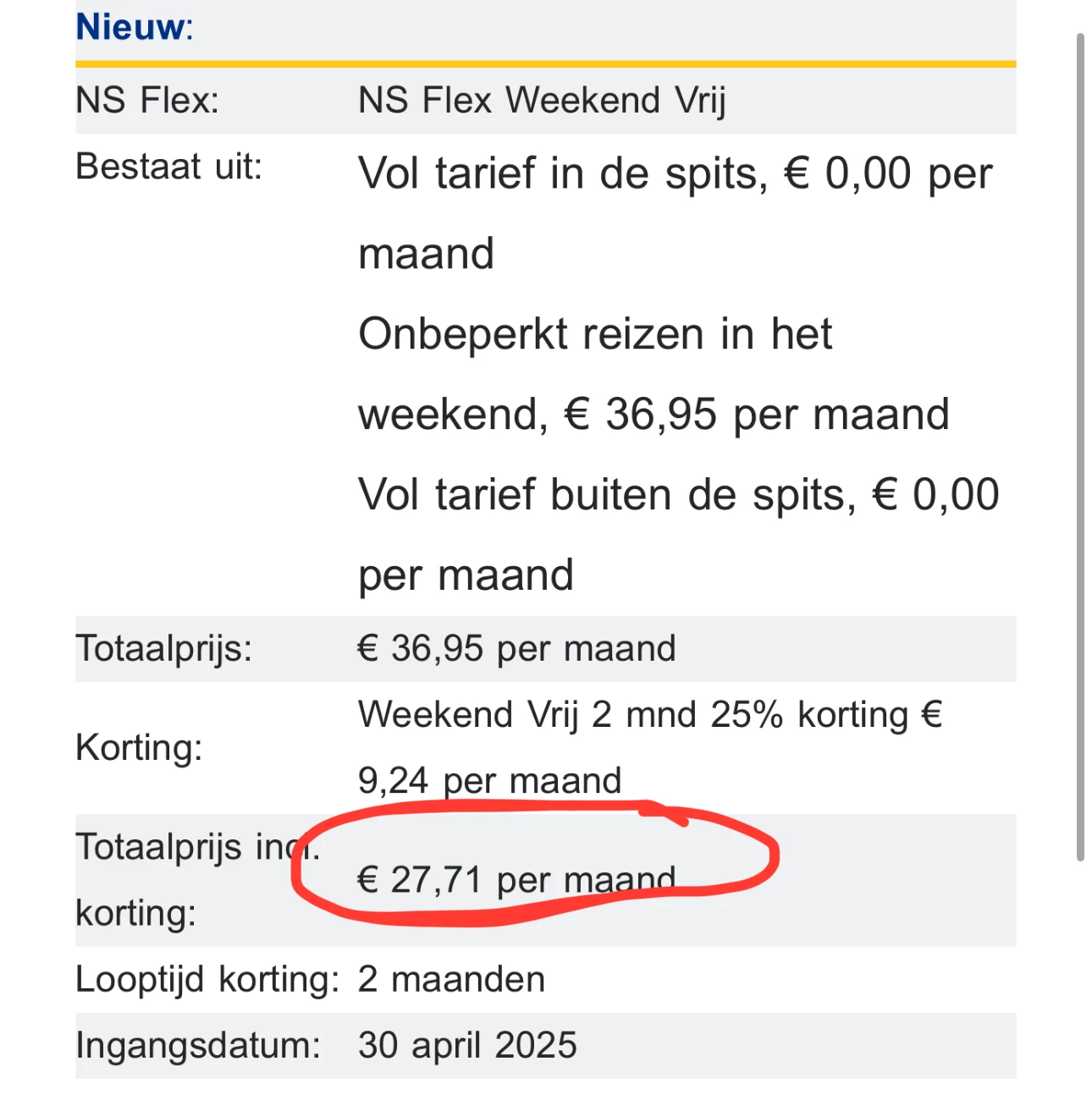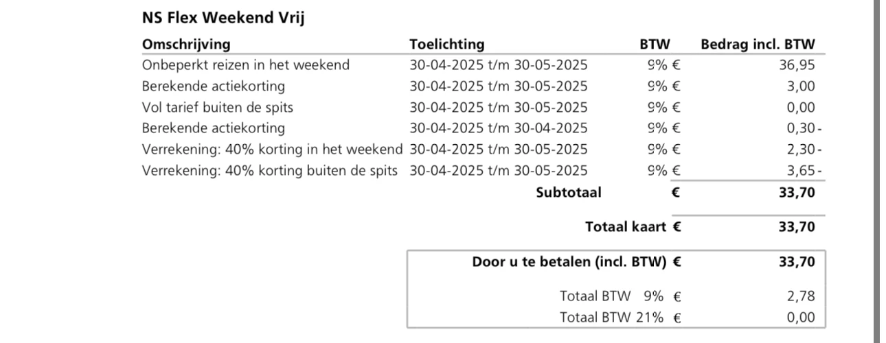 Ik heb het weekend vrij abonnement genomen met 2 maanden korting. In de eerste bijlage zie je ook dat dit zo verwerkt is, alleen zie ik het niet echt terug in het factuur? Kan het kloppen dat de korting er niet vanaf is gegaan?