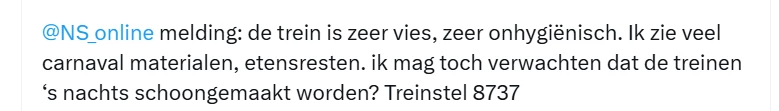 Niet fijn dat de trein waarmee je reist niet schoon is. Samen met het schoonmaakbedrijf waarmee wij werken zorgen we ervoor dat treinen regelmatig gereinigd worden, van binnen en van buiten. We ontkomen er echter niet aan dat er dan alsnog treinstellen rondrijden die niet schoon zijn op dit moment. Ik zet een melding door over het treinstel dat jij hier benoemt.