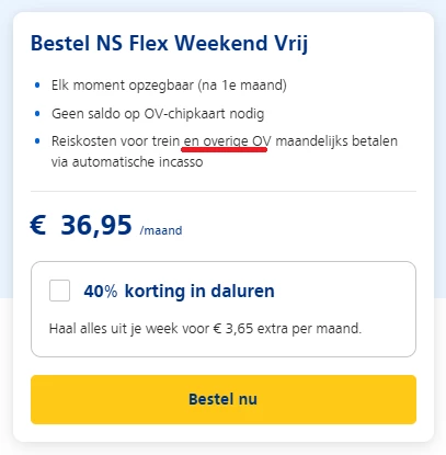 Met NS Flex reis je ook in bus/tram/metro op rekening. Je hebt dus ook daarvoor geen saldo meer nodig. Je betaalt daarvoor uiteraard wel het volle tarief.