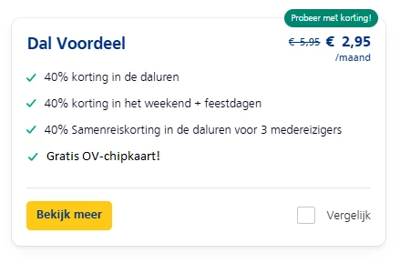 In lees ‘De verkoopadviesprijs van een OV-chipkaart is € 7,50. Als je een NS-abonnement neemt, ontvang je de persoonlijke kaart gratis (behalve bij Flex Basis en Flex Weekend Voordeel).’