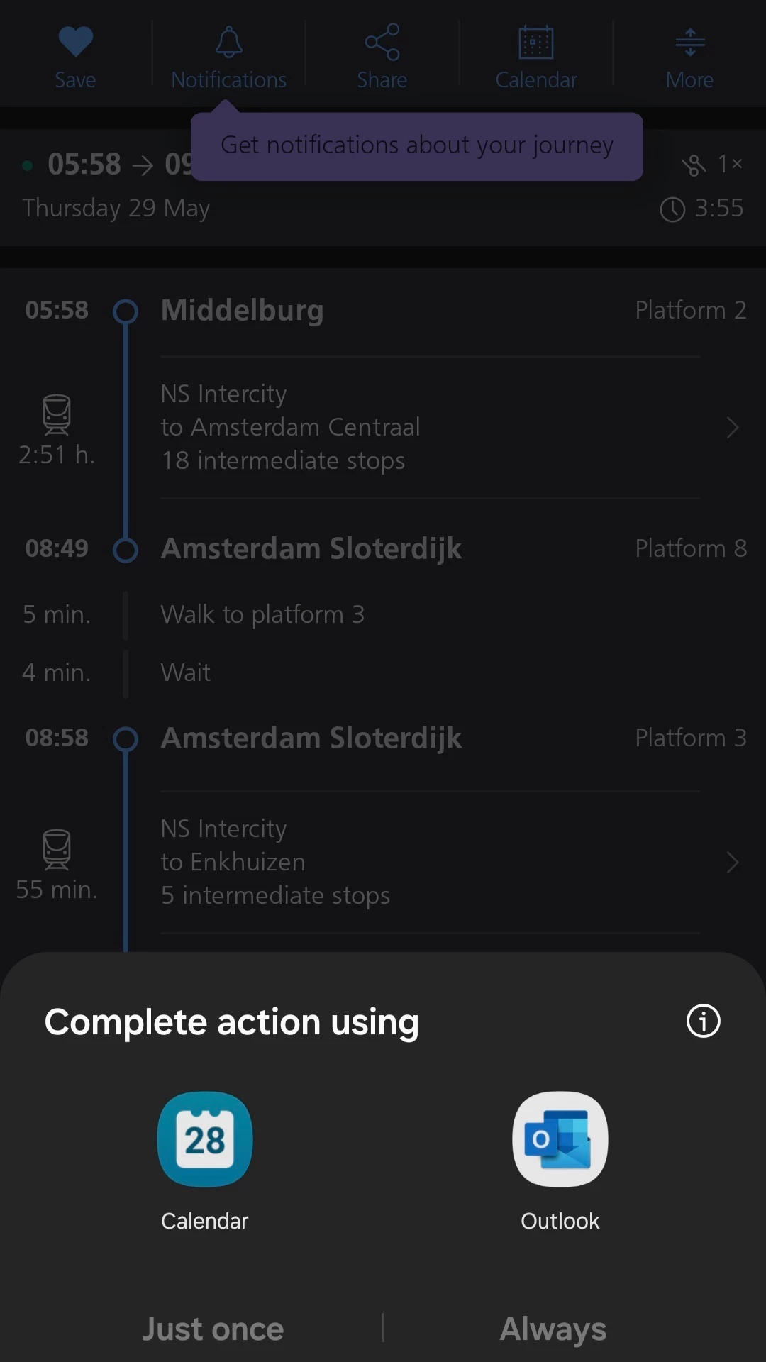 Wat mij wel lukt: Ga naar je webbrowser > Open een nieuw incognito tabblad > Ga naar NS.nl en plan je reis > Deel het reisadvies, en sla het op als agenda. Vervolgens open je dat bestand in de downloads op je telefoon. Dan staat Proton er wel tussen, en kun je de rit opslaan. Het incognito tabblad is nodig omdat je anders alsnog naar de NS app wordt gelinkt.