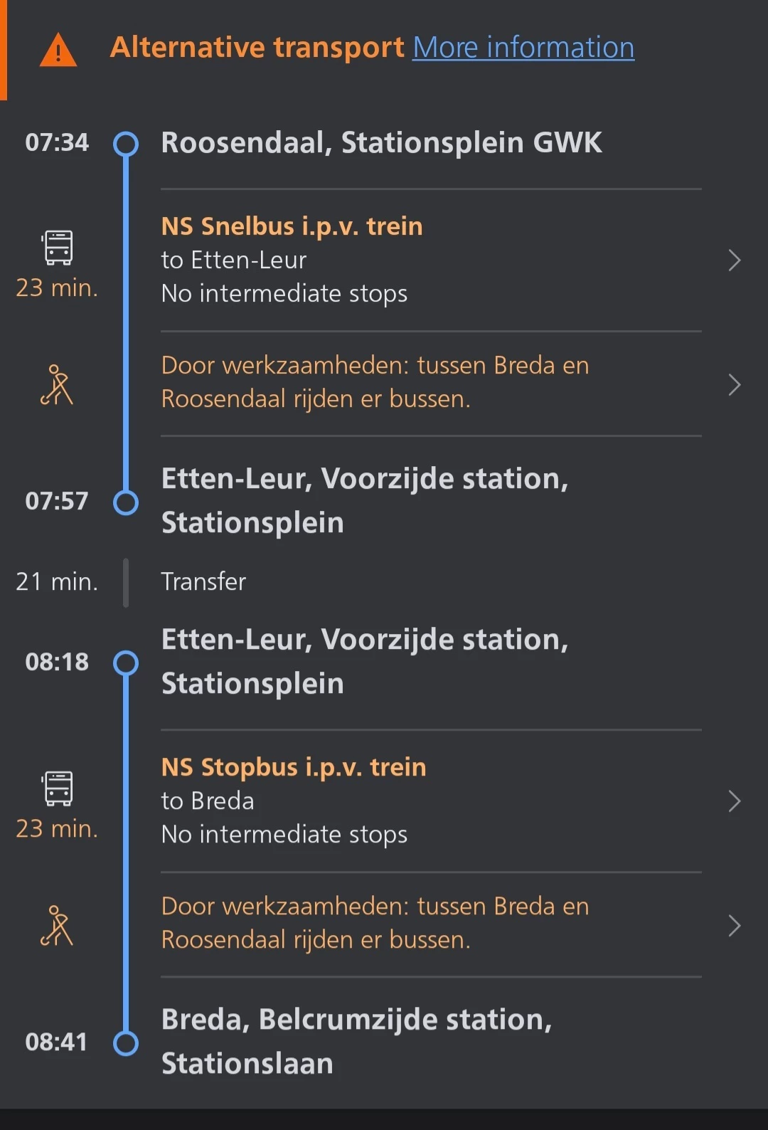 Als je van Roosendaal naar Breda moet, kun je beter omreizen via Lage Zwaluwe denk ik: